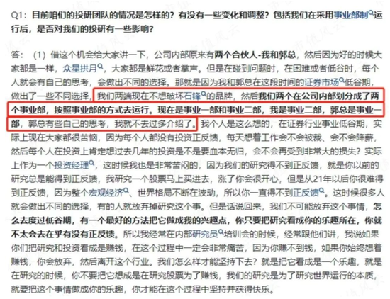 雪上加霜的是,业绩低迷之下,石锋资产的内部管理也出现裂痕。2023年,公司两位创始人郭锋与崔红建开启“分灶吃饭”模式,内部拆分为投资事业一部和二部,分别由二人执掌,其中一部主攻量化业务,两大事业部拥有独立决策权,昔日并肩作战的创业伙伴,最终走向“各自为战”。